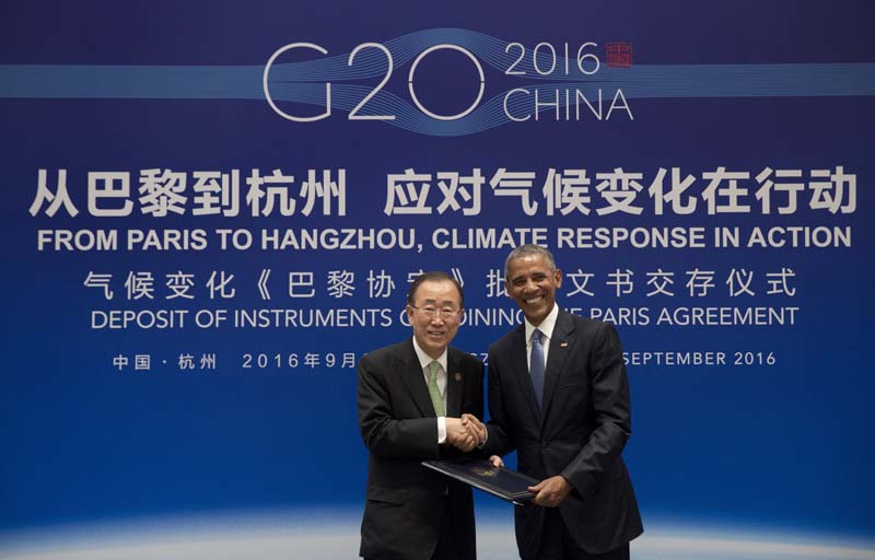 President Obama and United Nations Secretary-General Ban Ki-moon shake hands as the US formally joins the Paris Climate Agreement during a climate event at Westlake State House in Hangzhou, China, September 3, 2016